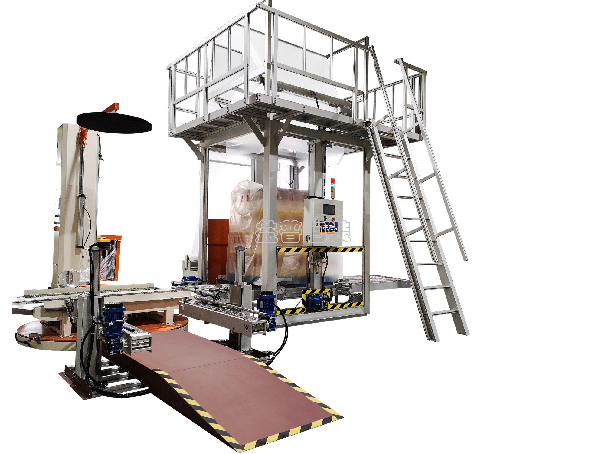 該系列垛板套袋機主要將塑料薄膜袋由上往下套上整垛產品上。設備啟動后,傳送系統將袋子傳送到開袋工位待機狀態,垛板輸送線將整垛產品輸入到套袋工位,套袋裝置啟動,將塑料袋由上往下勻速套在產品上,袋尾封切裝置啟動,套袋裝置回到原點,輸送系統啟動將產品輸送到下一工位。