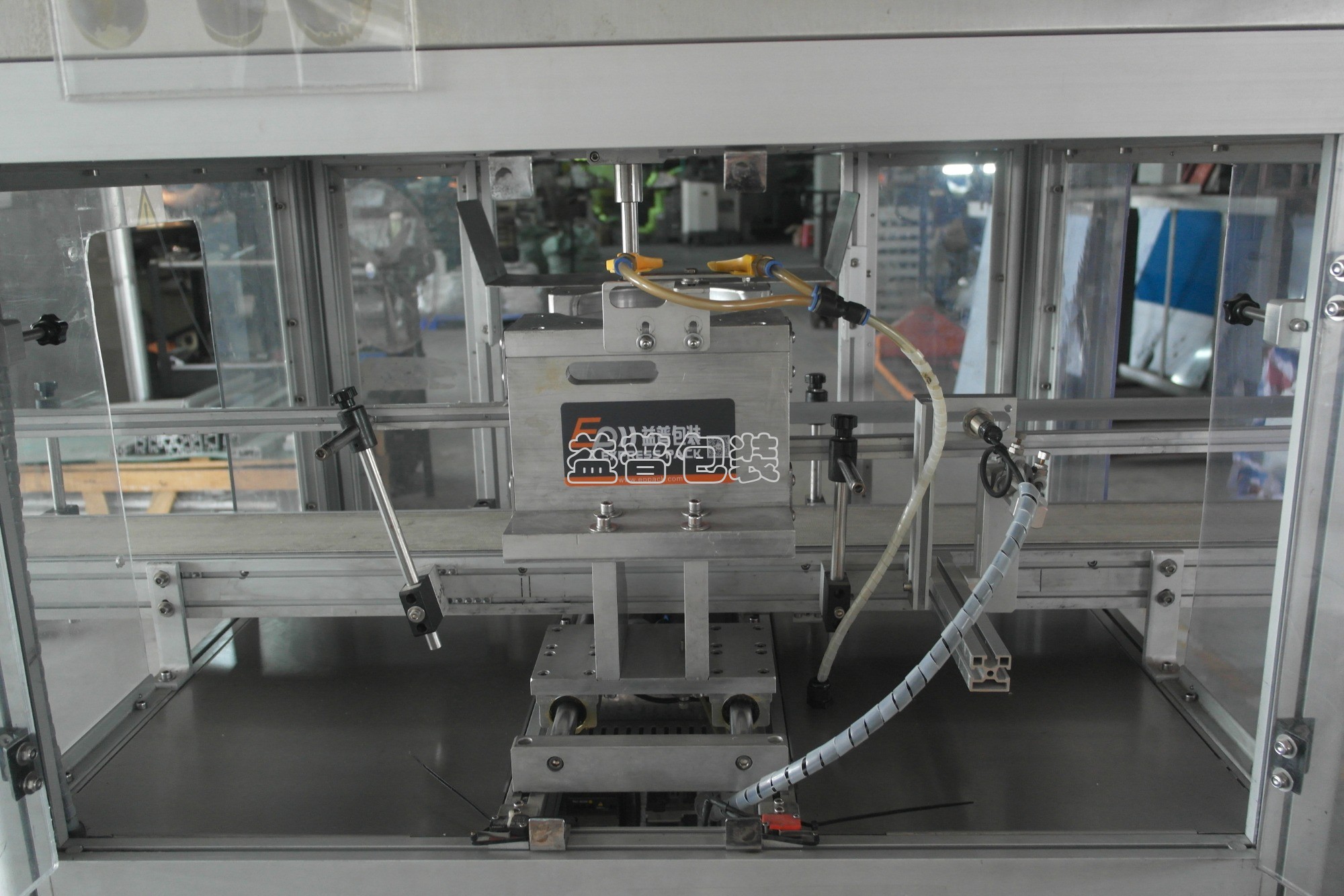 瓶子通過(guò)輸送帶進(jìn)入到切口工位,通過(guò)氣缸抱夾固定瓶身,切刀下降至葫蘆口,電機(jī)帶動(dòng)旋轉(zhuǎn)360°切除葫蘆口廢料;最后用氣嘴將葫蘆口廢料剔除。(廢料自行安排收集筐)